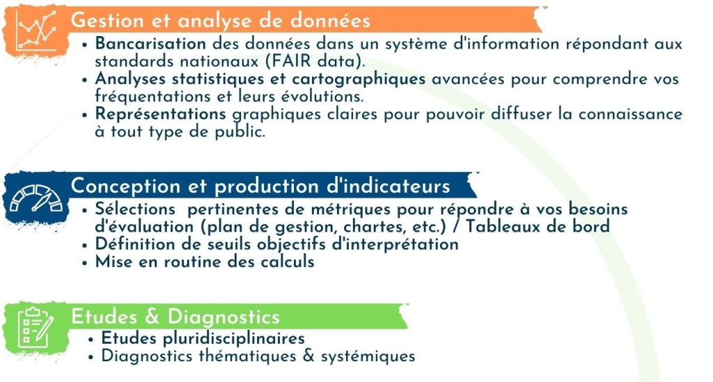s’intégrant dans le contexte spécifique de votre socio-écosystème. Ces études et diagnostics visent toujours à avoir un impact positif direct pour une gestion adaptative et intégrée des espaces naturels. Les démarches mises en œuvres ont aussi pour but de favoriser la concertation avec les acteurs de vos territoires.